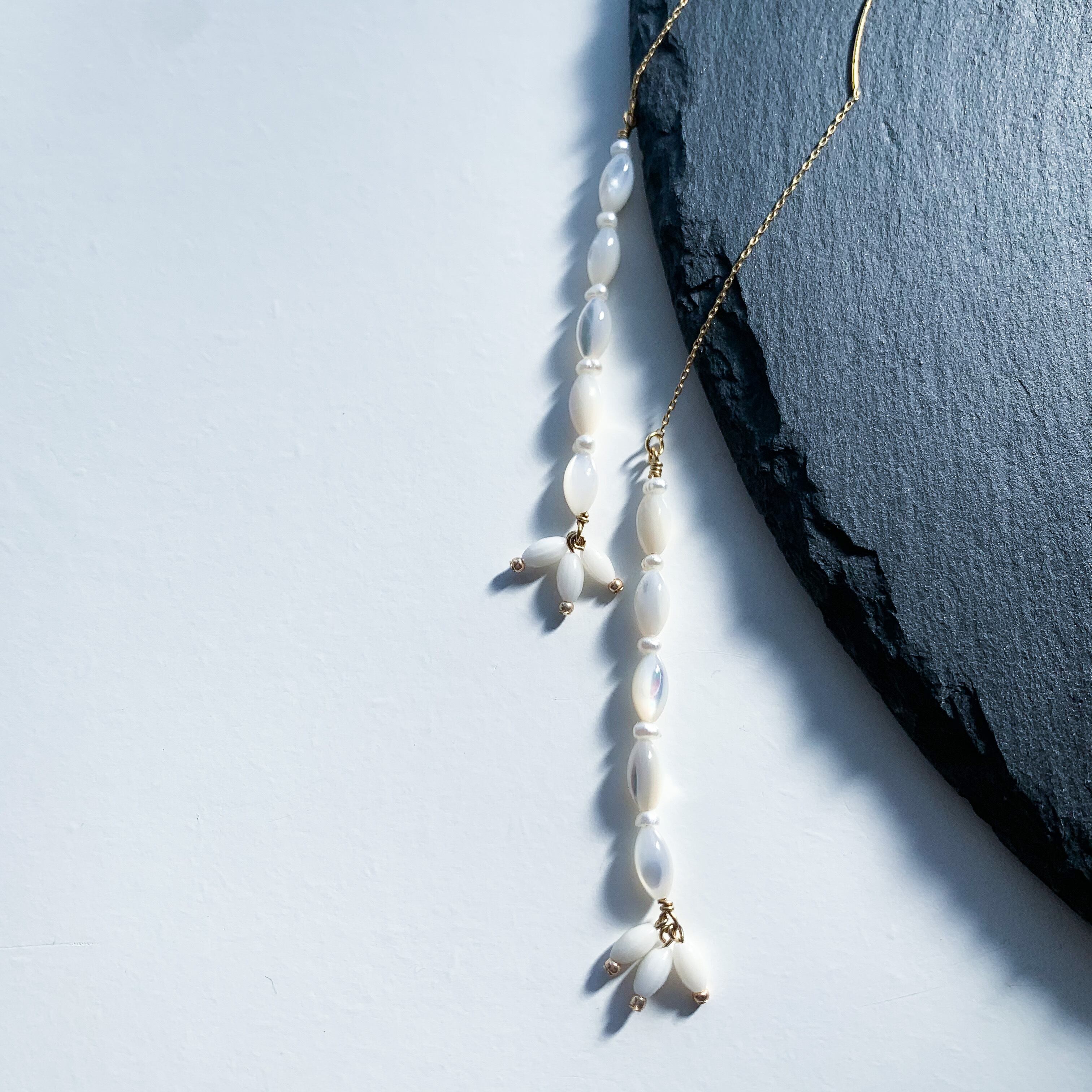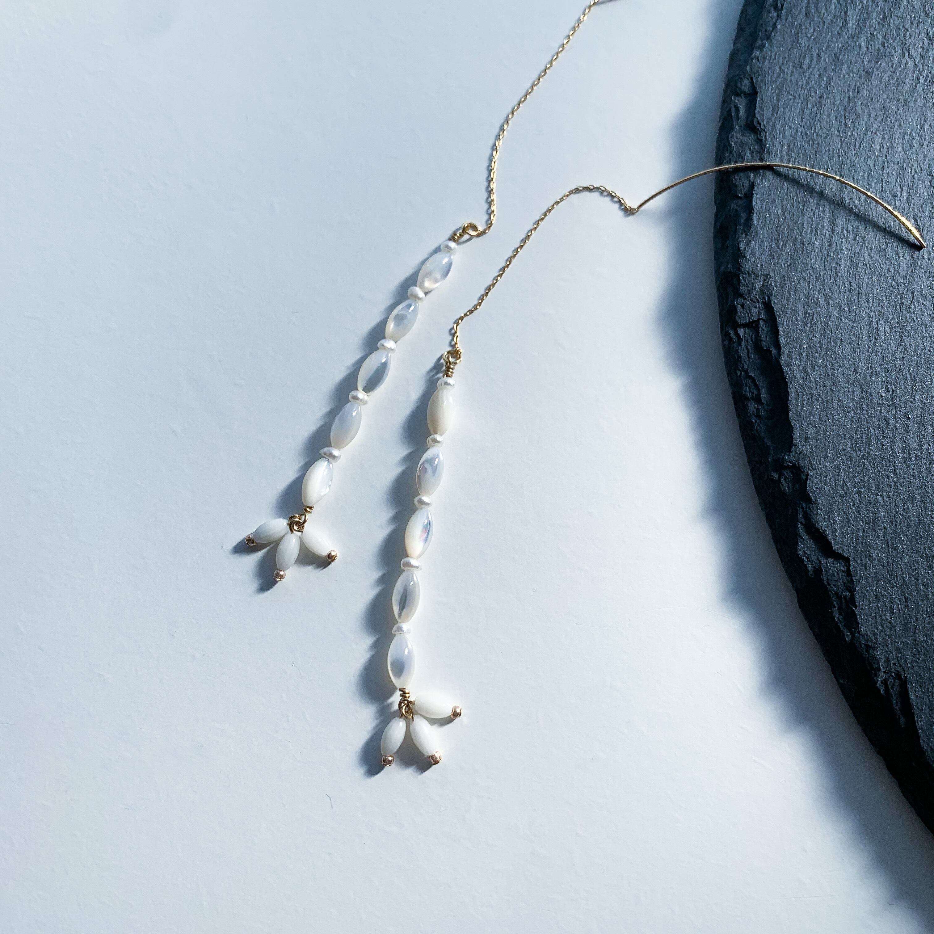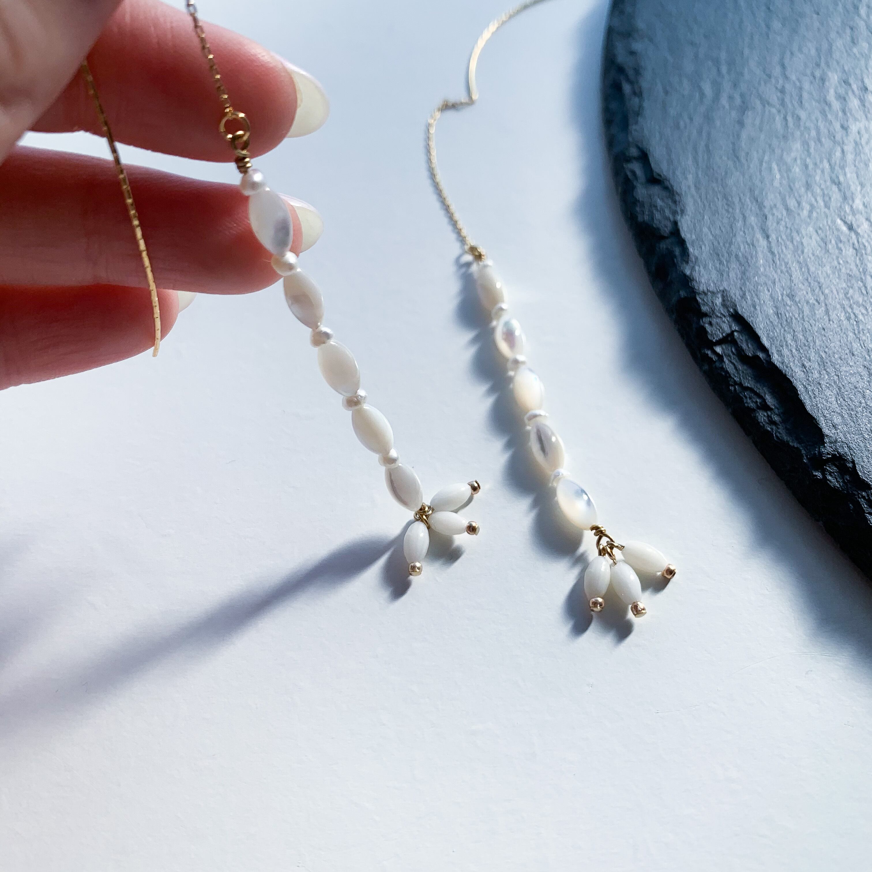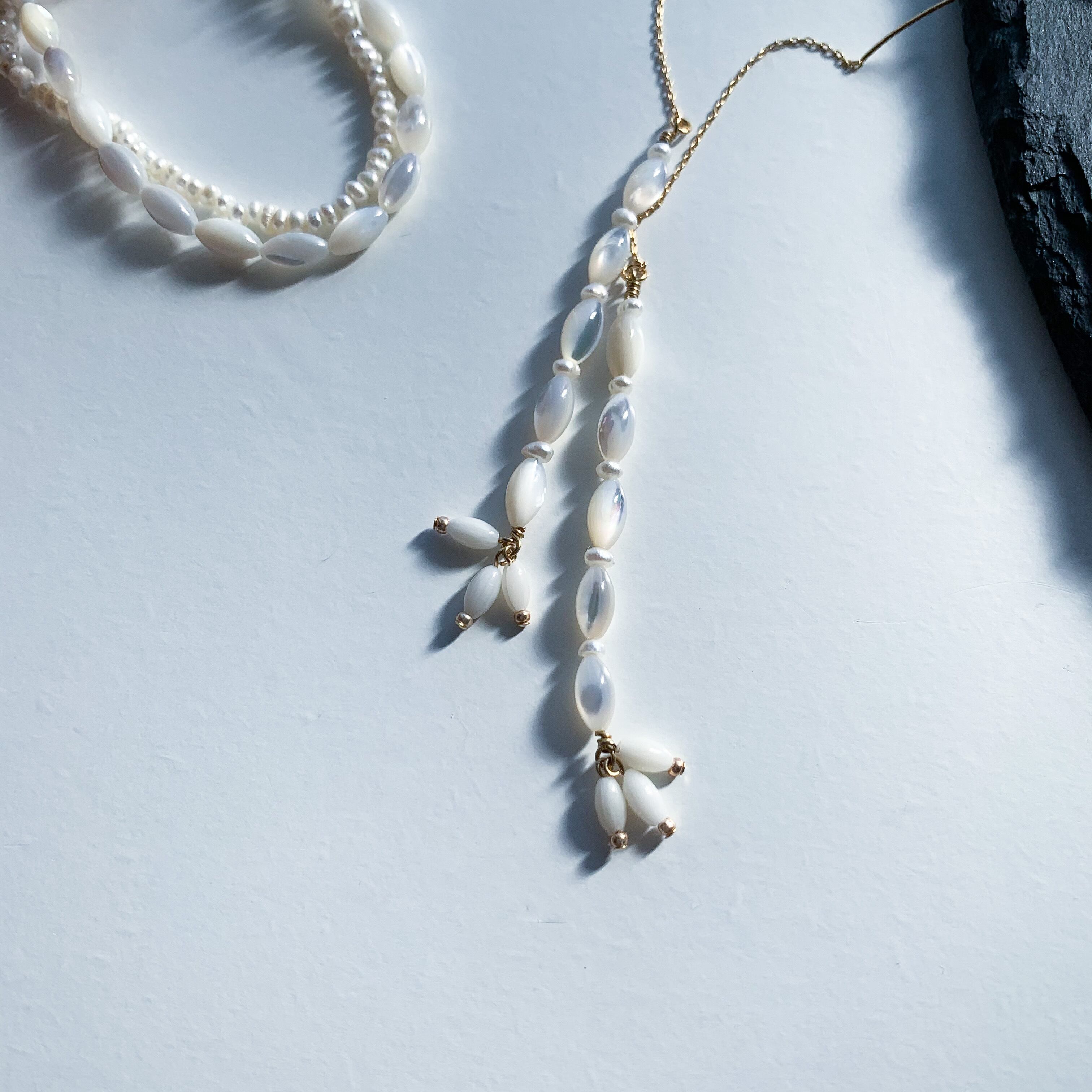 先端にはポイントで淡水パールとゴールドのビーズも使用しており、